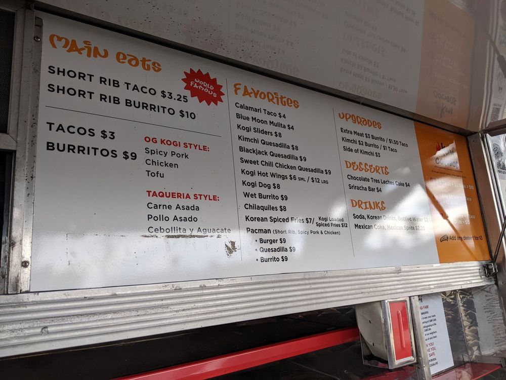 Kogi Taqueria is a popular Asian Fusion-Mexican food truck located in Los Angeles, CA. This trendy spot offers a wide range of options for all types of diners, including vegan and limited vegetarian options. The menu features world-famous Short Rib Tacos, Spicy Pork Kogi Tacos, Chicken Kogi Tacos, Tofu Kogi Tacos, and Carnitas Taqueria Style Tacos. Some must-try items include the Short Rib Burrito, Spicy Pork Kogi Burrito, Calamari Taco, and Blue Moon Mulita. The flavors are bold and unique, with a perfect balance of Asian and Mexican influences. With options for delivery, takeout, reservations, and catering, Kogi Taqueria is a go-to spot for casual, classy dining with friends or family. Don't miss out on the delicious food and vibrant atmosphere at Kogi Taqueria.